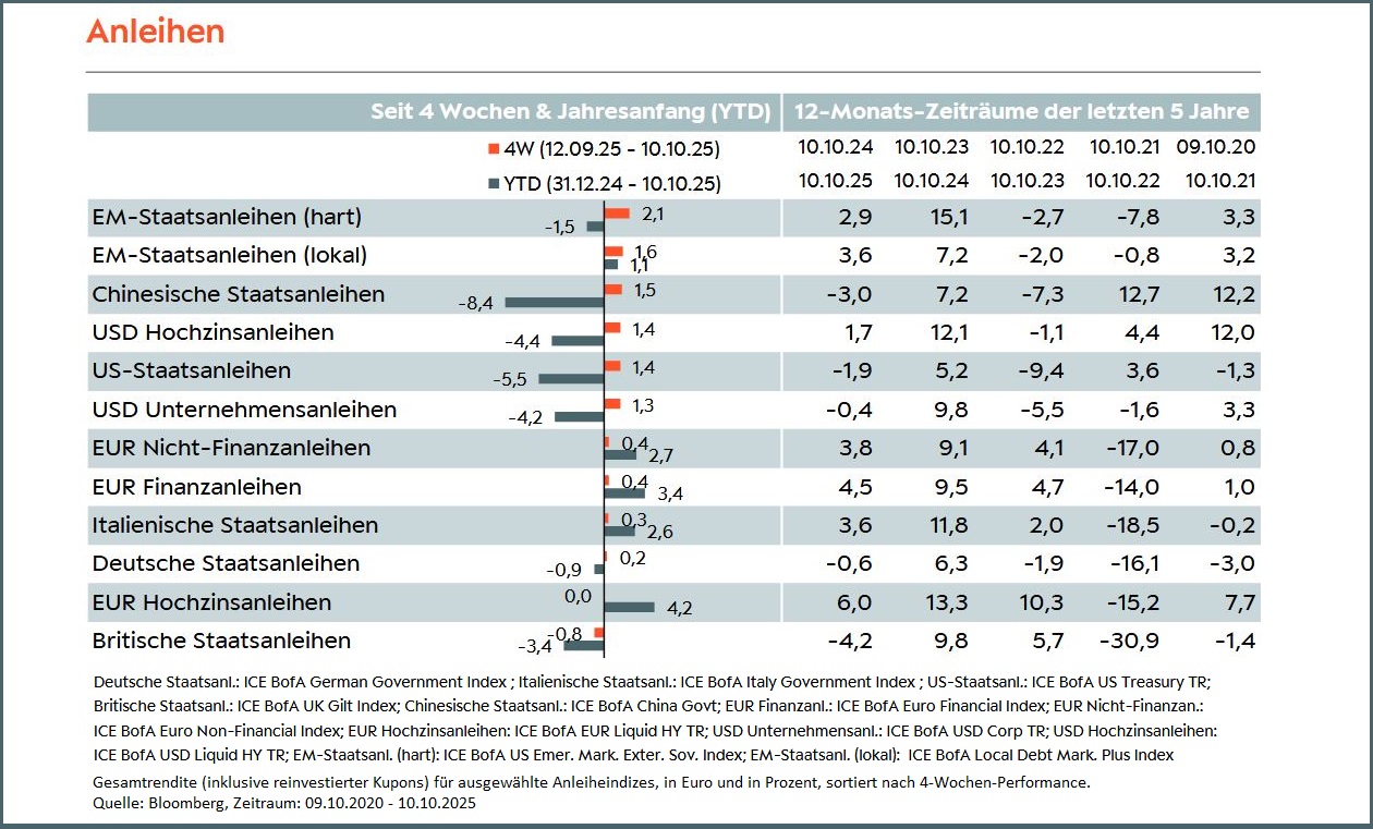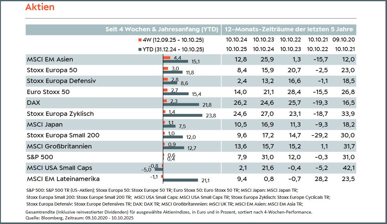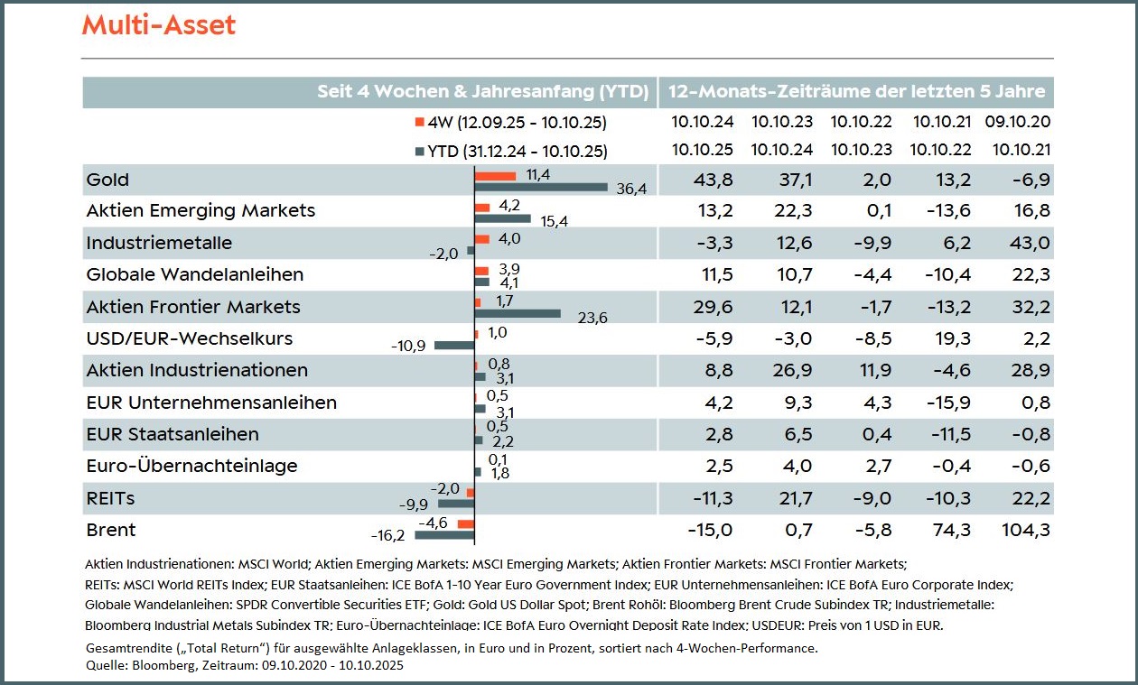 Die Aktienmärkte setzten ihren Aufwärtstrend trotz politischer Tumulte zunächst fort. Der S&P 500 und Euro Stoxx 50 markierten neue Allzeithochs. Der US-Shutdown geht derweil in die dritte Woche. In Frankreich hat sich die fiskalische Krise weiter zugespitzt. Lecornu soll nach seinem Rücktritt nun erneut versuchen, ein Budget für 2026 zu verhandeln. Mittlerweile rentieren OATs sogar höher als eine Reihe französischer Unternehmensanleihen. Japan bekommt indes die erste Premierministerin in der Geschichte. Sanae Takaichi gilt als Nationalistin und stimulus-freundlich. Japanische Aktien stiegen und der Yen wertete ab. Erst am Freitag störten Trumps neuen Zolldrohungen gegenüber China die Ruhe an den Märkten. Die Volatili tät sprang deutlich an, Aktienindizes gaben nach. Hoch positionierte systematische Strategien dürften kurzfristig weiter Aktien verkaufen. Diskretionäre Anleger, die deutlich geringer in Aktien positioniert sind, dürften die Rücksetzer aber für Käufe nutzen. Dies sollte das Rückschlagspotenzial begrenzen. Die Musik spielte zuletzt aber vor allem bei Edelmetallen. Gold durchbrach 4.000 USD je Unze und Silber stieg erstmals über 50. Wir bleiben strukturell Edelmetallbullen, haben allerdings nach der starken Rallye Teilgewinne mitgenommen.