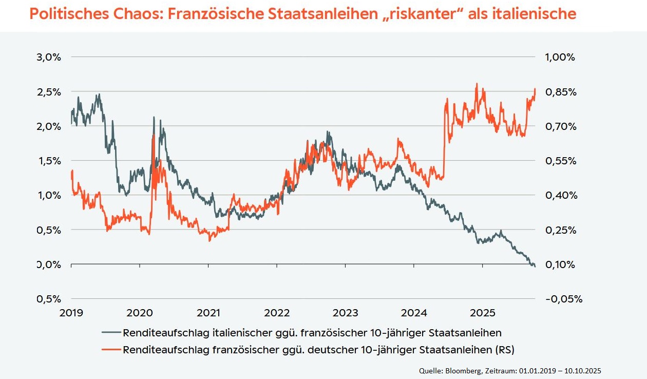 - Der Rücktritt des französischen Premiers Lecornu löste einen erneuten Abverkauf französischer Staatspapiere aus. Denn bei einer Sache sind sich rechts und links im stark gespaltenen Parlament einig: weniger Geld ausgeben kommt nicht in Frage. Damit bleibt die dringend benötigte fiskalische Disziplin vermutlich aus.