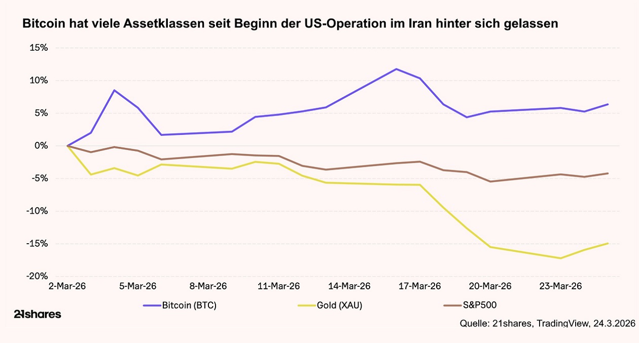 “Das große Decoupling”: Eine einfache Performance-Gegenüberstellung seit Beginn der US-Operation im Iran. Sie zeigt Bitcoin im Plus (+5 Prozent bis +10 Prozent), während Gold (bis zu -15 Prozent) und der S&P 500 (bis zu -5 Prozent) spürbar nachgeben.