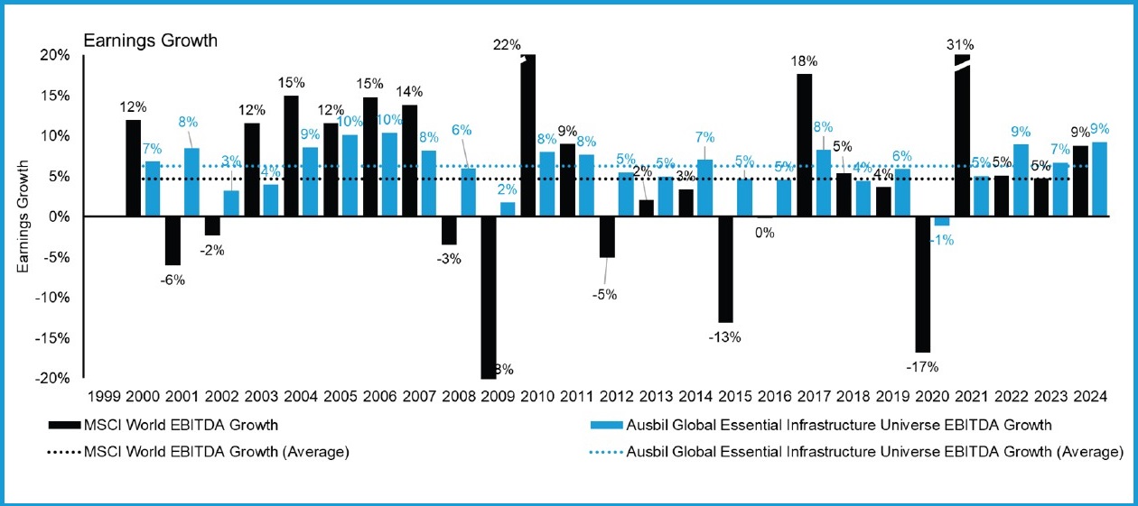 Abbildung 1: Das Gewinnwachstum von Infrastrukturanlagen verläuft deutlich gleichmäßiger als das globaler Aktien. Quelle: Ausbil Essential Infrastructure Universe, Stand Ende 2024. Daten zu globalen Aktien basierend auf dem MSCI World Index.