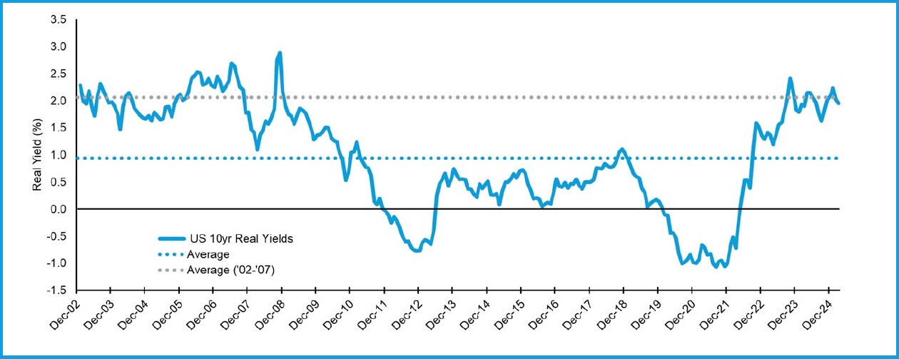 Quelle: Ausbil, Bloomberg. US-10-jährige Realrenditen basierend auf dem H15X10YR-Index; Inflationserwartungen gemäß dem USGGBE10-Index, Stand März 2025.