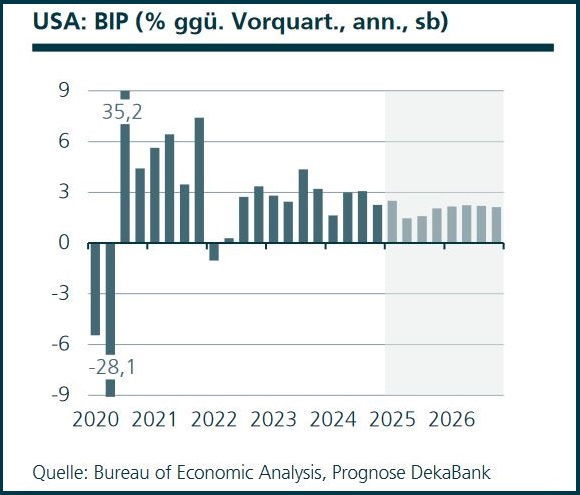 Das Bruttoinlandsprodukt ist im dritten Quartal überraschend stark angestiegen. Auffallend ist weiterhin die Stärke der Investitionen im KI-Bereich im Vergleich zur Schwäche in den weiteren Investitionsbereichen. Immerhin deuten die Stimmungsindikatoren an, dass die zollbedingte Verunsicherung weiter nachlässt. Zusammen mit einer Abnahme des geldpolitischen Restriktionsgrads dürften auch die anderen Investitionsbereiche in den kommenden Quartalen wieder zum gesamtwirtschaftlichen Wachstum beitragen.