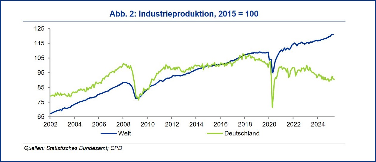 Auch wenn aktuell der schlechte Konjunkturausblick an den US-Zöllen festgemacht wird. Das Handelsabkommen zwischen der EU und den USA ist nur ein Aspekt von vielen: Es gibt die Euro-Aufwertung, die einen preislichen Wettbewerbsverlust nicht nur für die Exporte in die USA darstellt. Zudem hat sich der Wettbewerbsdruck und die Marktverdrängung durch China (s. Bundesbank 2024) verschärft, und die Weltwirtschaft wächst grundsätzlich schwächer. Weniger im Fokus – doch für den Industriestandort entscheidend – ist die Investitionszurückhaltung in Deutschland, die die deutsche Reaktion auf globale Impulse dämpft.