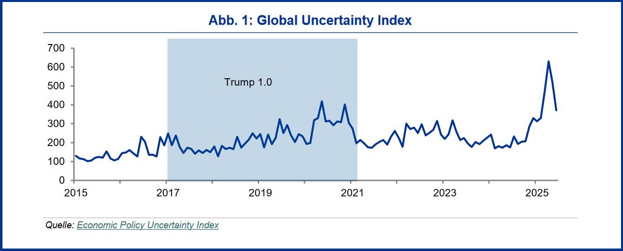 Aktuelle Schätzungen deuten auf einen Anstieg der effektiven Zölle für den US-Konsumenten von 2,4 Prozent im Jahr 2024 auf fast 20 Prozent hin – der höchste Stand seit rund 100 Jahren (s. State of U.S. Tariffs: July 10, 2025 | The Budget Lab at Yale). Die Zölle wurden noch nie so abrupt in dieser Höhe angepasst. Wieviel sich von dem Zollschock auf die US-Inflation, das US-Wachstum oder die Margen der Unternehmen niederschlagen wird, bleibt abzuwarten. Angesichts der Größenordnung ist davon auszugehen, dass es zu bedeutenden negativen Einflüssen auf das US-Wachstum kommen wird.