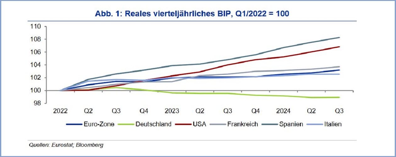 Bereits jeder vierte Euro des Staatshaushalts fließt in die Subventionierung der Rentenversicherung, fast die Hälfte ist für Sozialausgaben. Gleichzeitig ist die Steuerlast im internationalen Vergleich hoch – vor allem für Unternehmen, der Quelle von Wachstum und Wohlstand. Doch solange der Mythos von einem „reichen Land“ weiter besteht, fehlt die Bereitschaft für Verhaltensänderungen. Der BIP-Verlauf der deutschen Wirtschaft lässt jedoch kaum Zweifel an der Notwendigkeit weitreichender Reformen zu.
