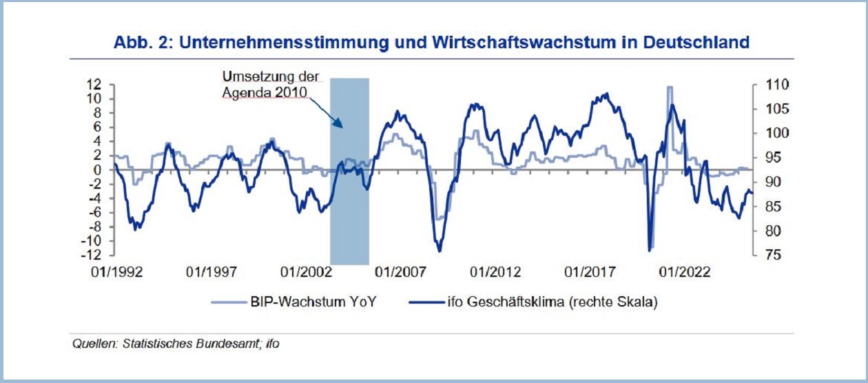 Eine grundlegende Neujustierung des Sozialstaats sowie eine spürbare Entlastung von Unternehmen sind jedoch unvermeidlich. Mutige Reformen können sehr wohl kurzfristig zu einer unterstützenden Stimmungsaufhellung von Unternehmen führen; dies hat die Agenda 2010 in den Jahren 2003 bis 2005 gezeigt. Aktuell braucht es dafür jedoch die Erkenntnis, wie ernst die Lage ist: Deutschland befindet sich in einem Prozess der De-Industrialisierung, und das Potenzialwachstum deutet auf anhaltende Stagnation hin.