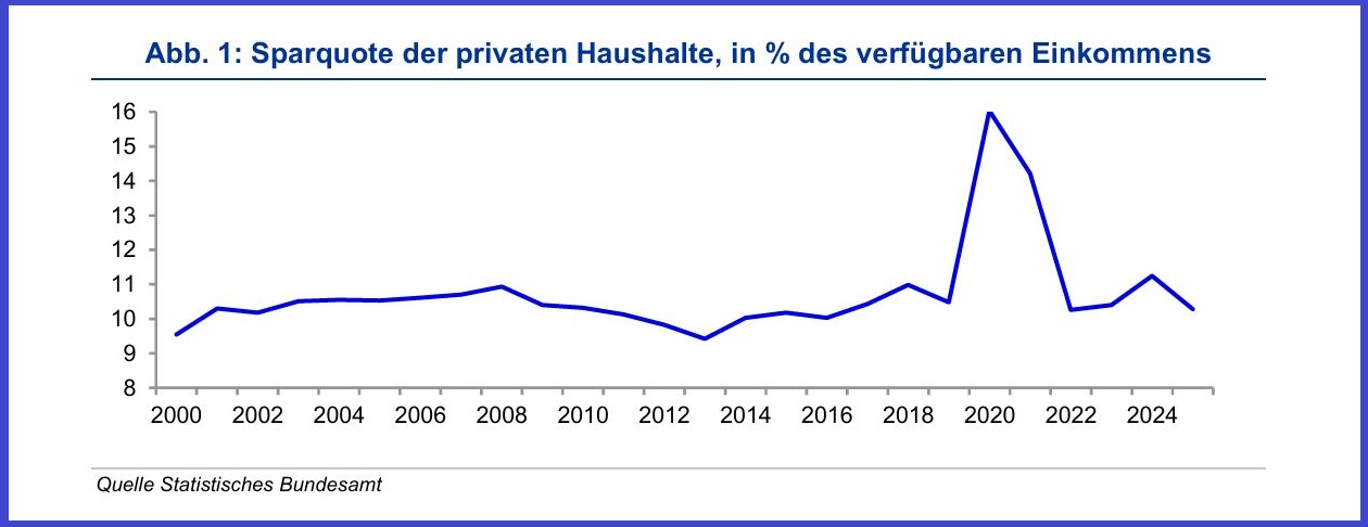 Der deutsche Konsument ist derzeit einer erhöhten Unsicherheit ausgesetzt. Sozialausgaben stehen auf dem Prüfstand, und das verfügbare Einkommen besserverdienender Haushalte könnte durch zusätzliche steuerliche Belastungen sinken. Gleichzeitig dürften die erwarteten Vermögensansprüche gegenüber dem Staat – insbesondere aus dem Rentensystem – zurückgehen. Gründe dafür sind längere Lebensarbeitszeiten, mögliche höhere Abschläge sowie die Erwartung, dass eine steigende Staatsverschuldung künftig in höheren Steuern resultieren wird (ricardianische Äquivalenz). All dies spricht für eine weiter steigende Sparquote.