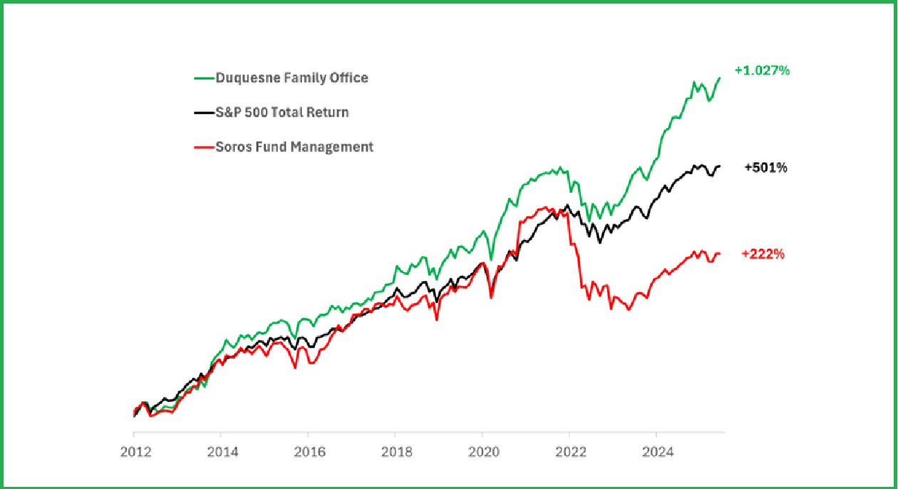 Druckenmiller zählt zu den rund 60 Köpfen, die wir für den Vates Aktien USA beobachten und deren 13F-Meldungen wir regelmäßig auswerten. Angesichts seiner Leistungen lohnt sich ein Blick auf seinen Track Record und seine Vorgehensweise.