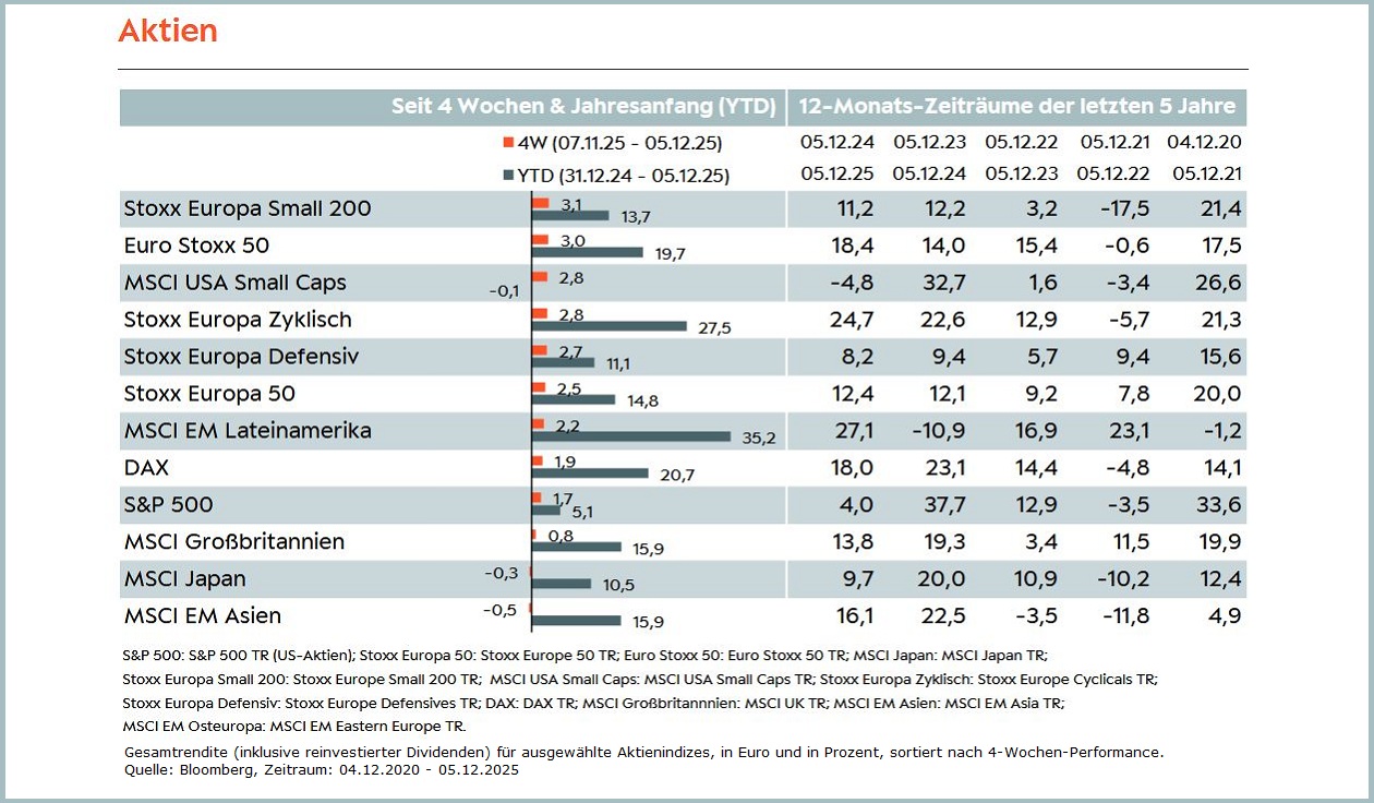 - Die globalen Aktienmärkte konnten sich in den vergangenen vier Wochen in Euro gerechnet nahezu alle positiv entwickeln. Besonders stark entwickelten sich europäische sowie US-Small Caps. Auch europäische Zykliker profitierten.