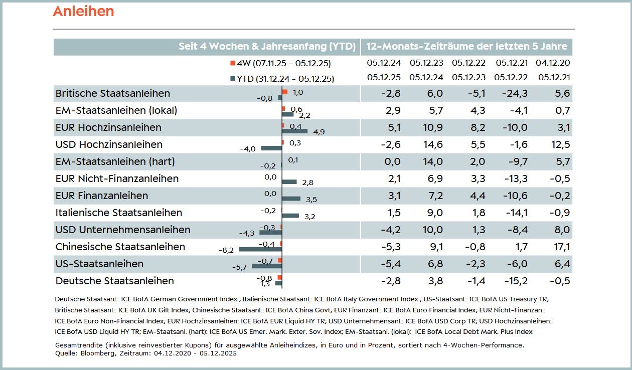 - Positiv entwickeln konnten sich zudem zuletzt auch Lokalwährungsanleihen der Schwellenländer sowie EUR- und USD-Hochzinsanleihen.