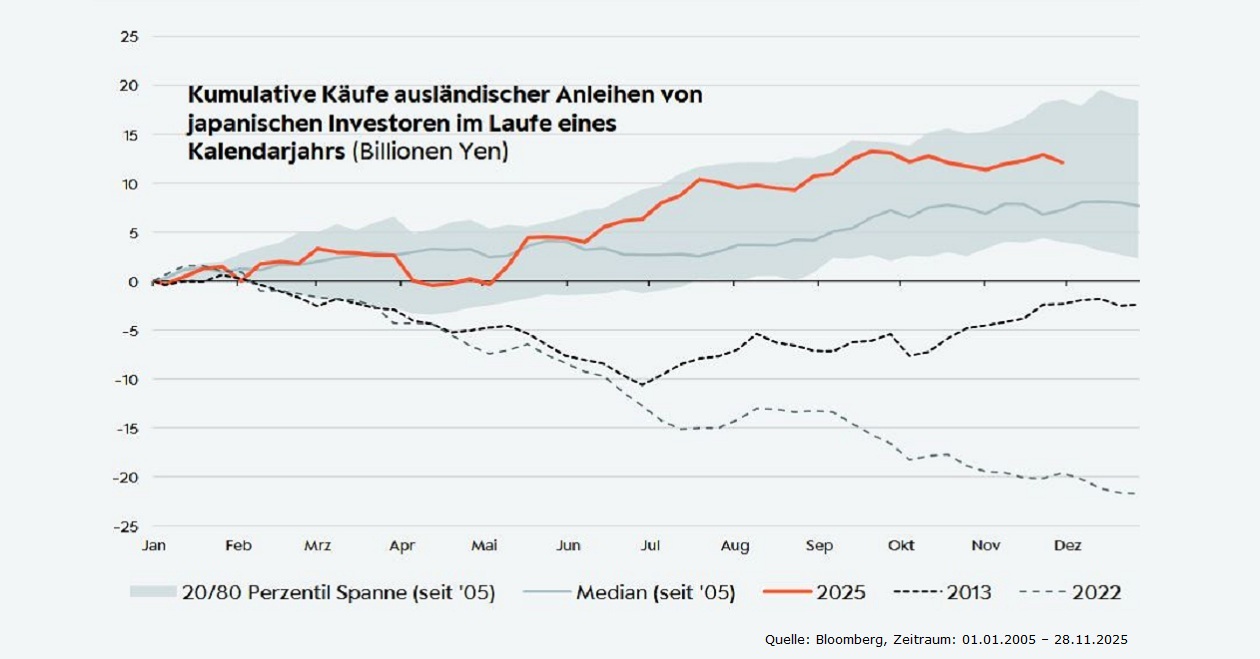 - Bis jetzt ist dies nicht der Fall. Anders als in 2013 oder 2022 kaufen japanische Investoren weiterhin internationale Anleihen im großen Stil