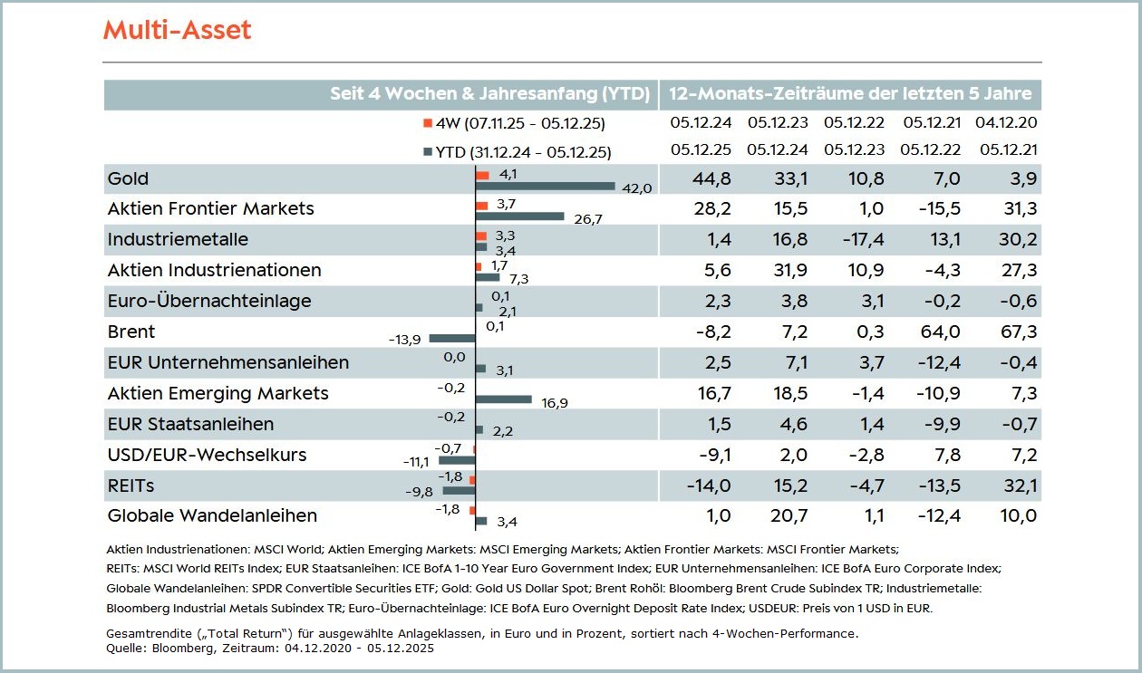 - Neben Aktien aus den Frontiermärkten entwickelten sich auch Industriemetalle und Aktien der Industrienationen zuletzt in Euro gerechnet positiv.