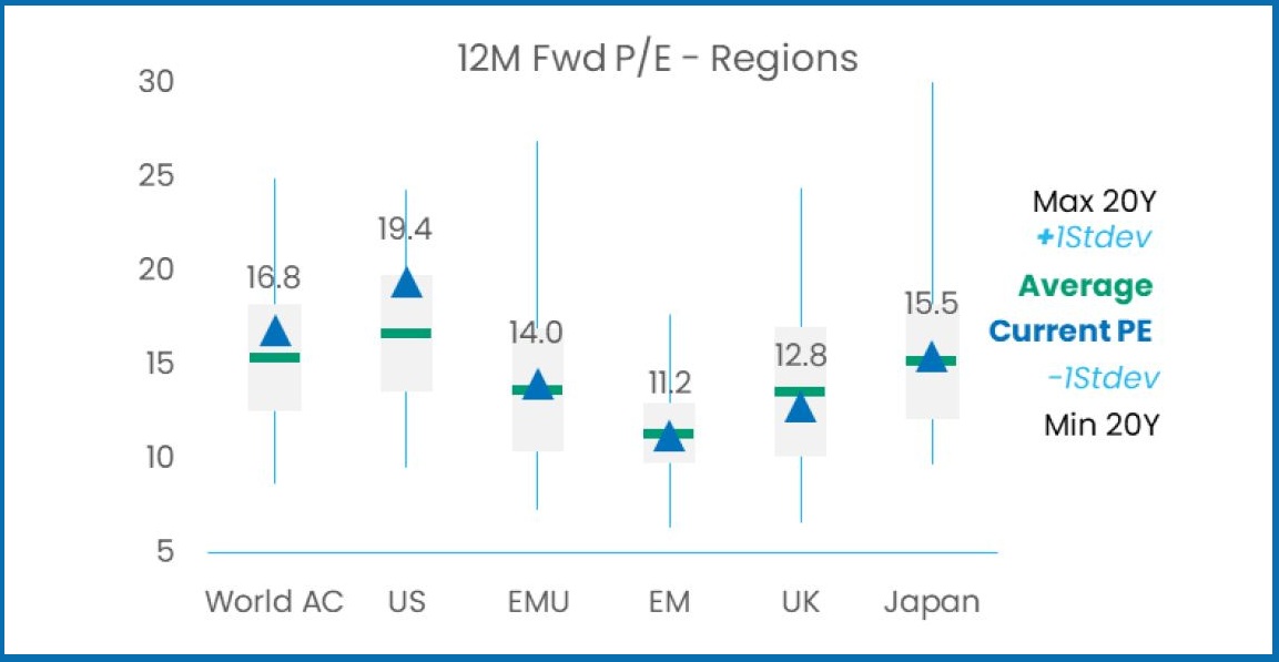Quellen: Candriam, LSEG Datastream, MSCI, Bloomberg©. Diese Grafik zeigt das Kurs-Gewinn-Verhältnis auf Basis der Gewinnerwartungen für die kommenden zwölf Monate für globale und regionale Aktienindizes. Die Zahl und das Dreieck kennzeichnen die aktuelle Bewertung zusammen mit mehreren statistischen Beobachtungen in den letzten zwei Jahrzehnten.