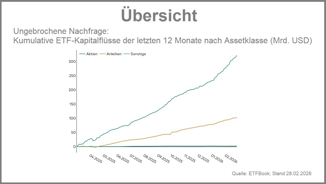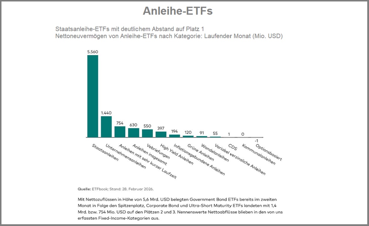 Anleihe-ETFs beendeten den Februar mit Nettozuflüssen von 9,8 Mrd. US-Dollar und blieben damit ebenfalls klar im Plus, auch wenn sie hinter der Dynamik der Aktienseite zurückblieben. Besonders gefragt waren erneut Strategien auf Staatsanleihen, die mit 5,6 Mrd. US-Dollar bereits im zweiten Monat in Folge den Spitzenplatz belegten. Corporate-Bond-ETFs folgten mit 1,4 Mrd. US-Dollar, ultrakurze Laufzeiten mit 754 Mio. US-Dollar. Nennenswerte Nettoabflüsse blieben auch im Fixed-Income-Bereich weitgehend aus.