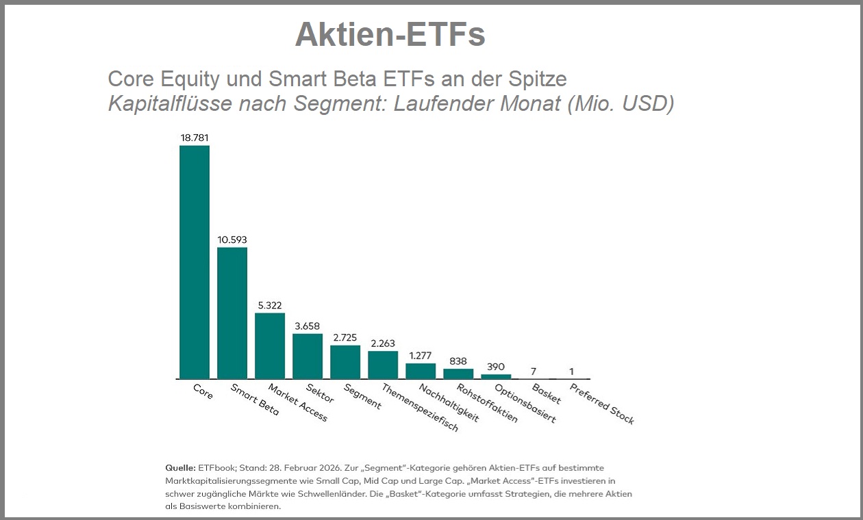 Aktien-ETFs waren auch im Februar der mit Abstand wichtigste Wachstumstreiber. Allein in diese Kategorie flossen 45,9 Mrd. US-Dollar, davon 18,8 Mrd. US-Dollar in Core-Equity-ETFs. Damit blieben breit diversifizierte Basisbausteine die erste Wahl für viele Anleger.