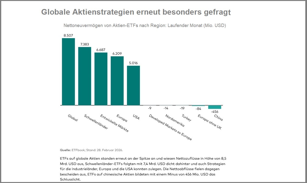 Auf regionaler Ebene standen globale Aktienstrategien erneut an der Spitze. ETFs auf globale Aktien verzeichneten Zuflüsse von 8,5 Mrd. US-Dollar und bestätigten damit ihre Rolle als bevorzugtes Kerninvestment. Auffällig stark war zudem die Nachfrage nach Schwellenländer-ETFs, die mit 7,4 Mrd. US-Dollar dicht folgten. Auch Strategien auf Industrieländer, Europa und die USA konnten zulegen. Nur vereinzelt kam es zu Abflüssen; ETFs auf chinesische Aktien bildeten mit einem Minus von 456 Mio. US-Dollar das Schlusslicht.