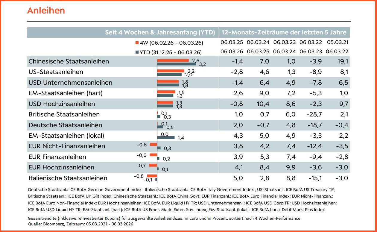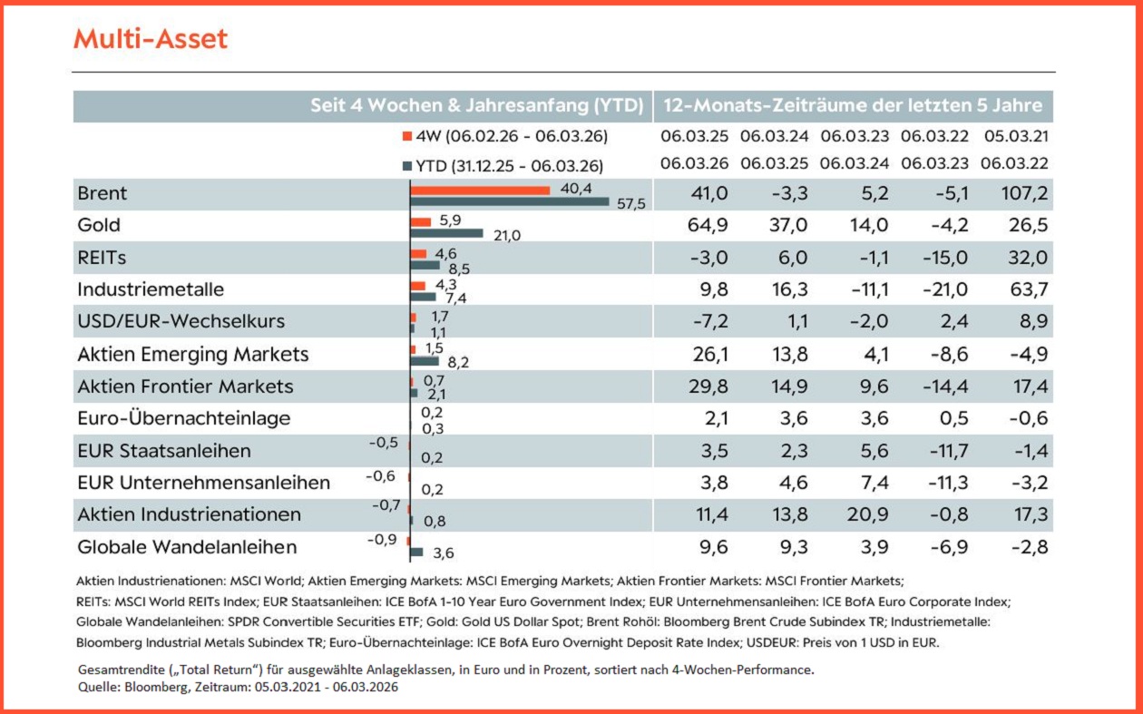 Auch in dieser Woche dürfte der Nahost-Konflikt das treibende Thema an den Märkten sein, bei dem bislang noch kein Ende absehbar ist. Wenngleich unser Basisszenario ein zeitnahes Kriegsende vorsieht, besteht das Risiko einer längeren Auseinandersetzung und damit auch länger höheren Energiepreisen, welche sich negativ auf die Verbraucherpreise auswirken könnten. Abseits vom Nahost-Konflikt fanden am Sonntag die Landtagswahlen in Deutschland statt. Heute Morgen erschienen neben den chinesischen Verbraucherpreisen (Feb.) zunächst Daten zur Industrieproduktion aus Deutschland (Jan.). Morgen stehen zudem die deutschen Exportdaten (Jan.) auf dem Kalender. Der Fokus dürfte sich jedoch auf die US-Verbraucherpreise (Feb.) am Mittwoch richten. Während am Donnerstag die Erstanträge für Arbeitslosenunterstützung (Mrz.) veröffentlicht werden, erscheinen am Freitag Daten zu den Einkommen & Ausgaben privater Haushalte aus den USA (Jan.) sowie das Verbrauchervertrauen der Universität von Michigan (Mrz.). In der Folgewoche stehen wichtige Zentralbanksitzungen an.