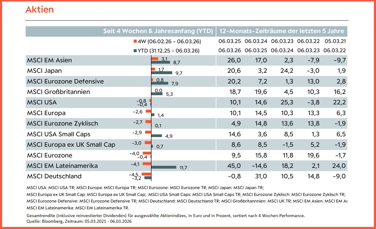 - Die Eskalation des Nahost-Konfliktes und die damit gestiegenen Rohölpreise haben insbesondere jene Aktien getroffen, welche eine große Abhängigkeit von Energieimporten haben, allen voran Aktien aus der Eurozone und Asien – auch wenn letztere über die letzten vier Wochen noch zu den größten Gewinnern zählen.