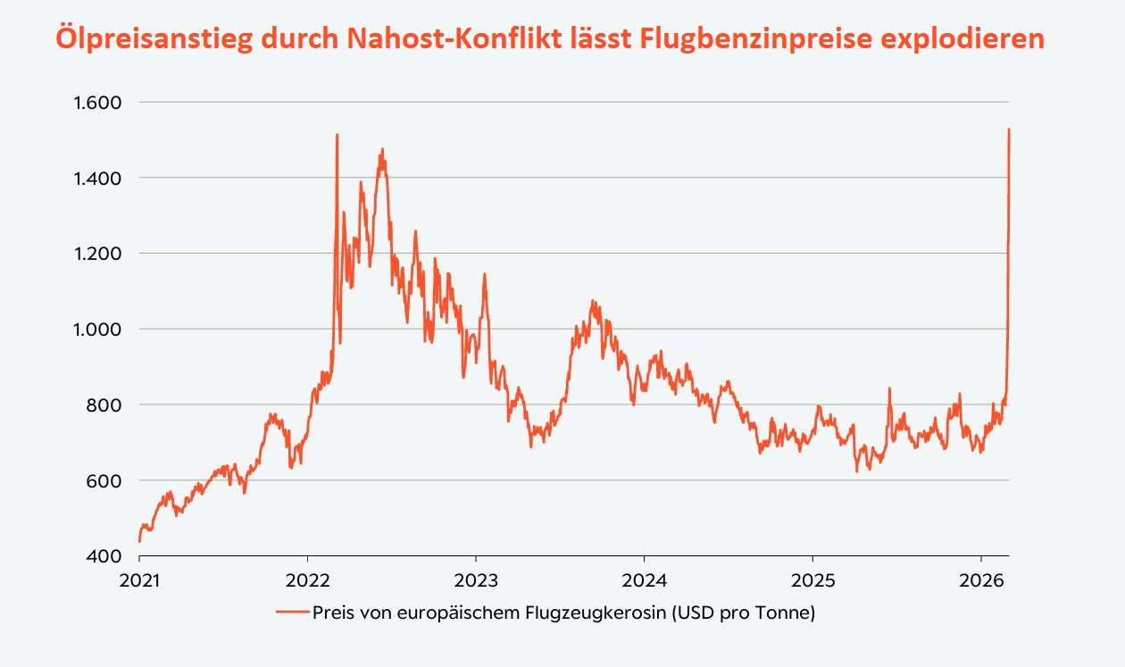 - Der durch den Nahost-Konflikt aus gelöste Ölpreisanstieg von rund 25 Prozent führte zu deutlichen Verwerfungen entlang der gesamten Versorgungskette. Besonders sichtbar wird dies bei raffinierten Ölprodukten wie europäischem Flugbenzin, welches seit der Eskalation über 80 Prozent zulegte und damit neue Höchststände markierte.