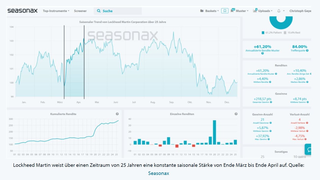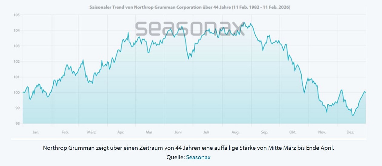 Northrop Grumman stellt unter anderem die Feststoffraketen her, die den hauptsächlichen Startschub liefern. Einen Schub im Chart geniest Northrop in 33 der letzten 44 Jahre im Zeitraum von Mitte März bis Ende April. Hier konnte in den positiven Jahren durchschnittlich fast 8 Prozent eingenommen werden.