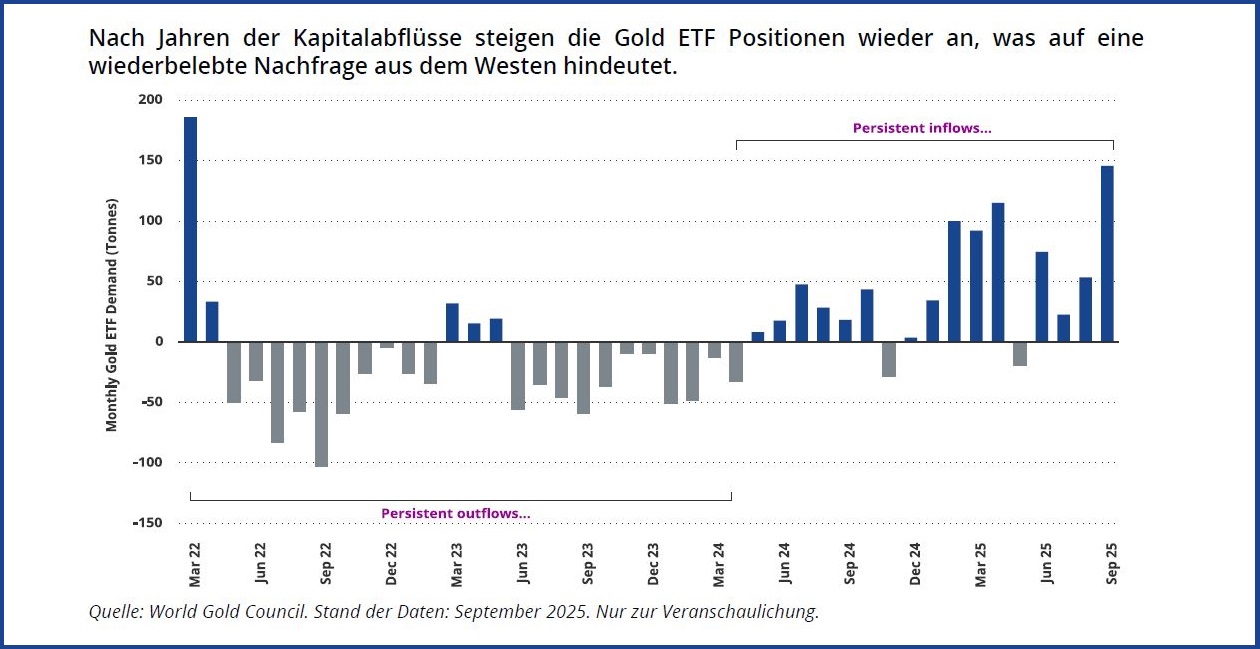 Nach mehreren Jahren mit Kapitalabflüssen aus ETFs ist die westliche Investitionsnachfrage nach Gold im Jahr 2025 deutlich zurückgekehrt, wobei die Zuflüsse in Gold ETFs von Monat zu Monat zunehmen. Die Bestände an Gold ETFs liegen weiterhin deutlich unter den vorherigen Höchstständen, was darauf hindeutet, dass das Engagement der Anleger in dieser Anlageklasse noch Spielraum für eine Normalisierung im Vergleich zu historischen Werten hat.