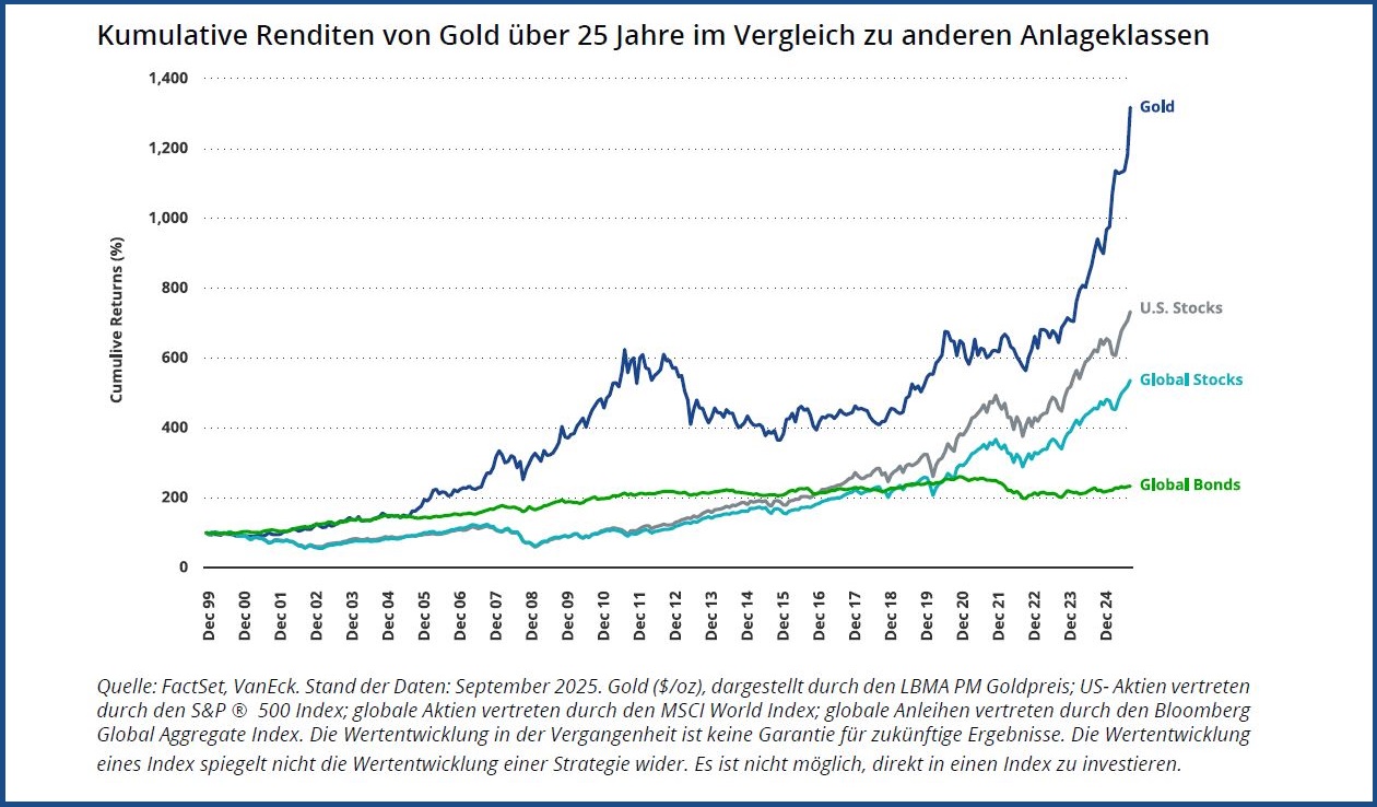 In den vergangenen 25 Jahren erzielte Gold kumulierte Renditen von über 1.300 Prozent und übertraf damit globale Anleihen und konnte mit wichtigen Aktienindizes mithalten. Die Beständigkeit des Metalls über verschiedene Konjunkturzyklen hinweg unterstreicht nicht nur seine Rolle als Diversifizierungsinstrument, sondern auch als langfristige Wertanlage.