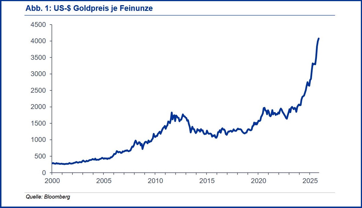 Welches Bild spiegelt der aktuelle Goldpreis wider, wie wahrscheinlich ist eine Bestätigung dieses Niveaus und was wäre nötig, um weiteren Auftrieb zu erwarten? Veränderungen im US-Dollar-Goldpreis lassen sich auf Quartalsbasis relativ gut durch globale Unsicherheit (gemessen am Economic Policy Uncertainty Index), den 10-jährigen US-Renditen und den gewichteten US-Dollar-Wechselkurs erklären. Inflation kann, muss aber nicht explizit berücksichtigt werden, sondern zeigt sich indirekt in der Entwicklung der US-Renditen und der politischen Unsicherheit. Der aktuelle Goldpreis liegt mit knapp über 4.000 US-Dollar je Feinunze über dem geschätzten fundamentalen Wert von rund 3.600 US-Dollar für Q4. Dies deutet auf eine gewisse Übertreibung hin. Die entscheidende Frage ist jedoch, wie sich die fundamentale Bewertung in den kommenden Quartalen entwickeln wird – denn Märkte sind vorausschauend