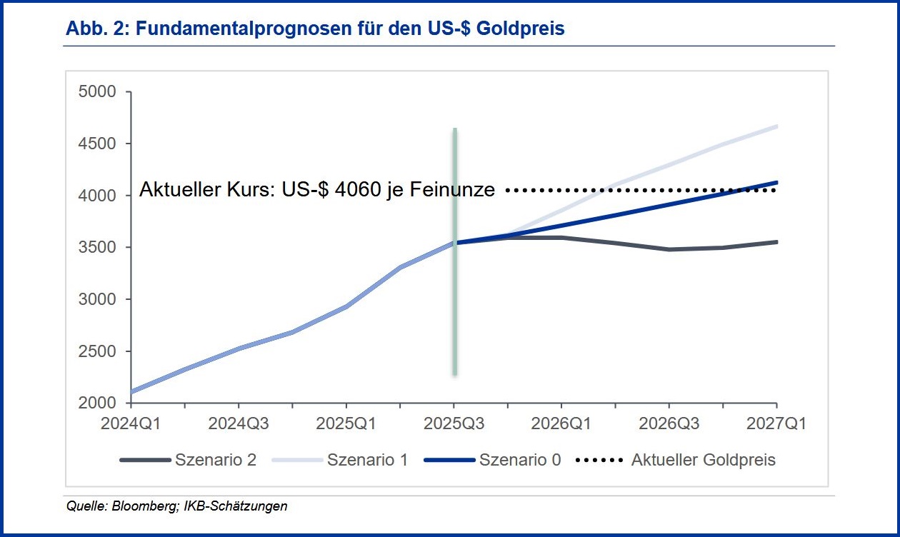 Die aktuellen Treiber des Goldpreises deuten bis Ende 2026 auf ein Niveau von etwa US-Dollar 4.000 je Feinunze hin. Eine robuste US-Wirtschaft würde hingegen Werte von um oder sogar unter US-Dollar 3.500 nahelegen, während eine schwache Wirtschaft und sinkende Zinsen einen Anstieg auf US-Dollar 4.500 begünstigen könnten. Die Unterschiede erscheinen überschaubar, was daran liegt, dass keine extremen Zinsannahmen zwischen Szenario 1 und 2 getroffen wurden. Extreme Annahmen würden ein breiteres Spektrum von Goldpreisentwicklungen zulassen.