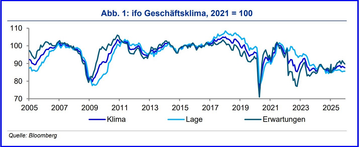 Seit 2018 weist das ifo Geschäftsklima einen grundsätzlich negativen Trend auf. Auch die seit 2024 erkennbare Stabilisierung reicht bislang nicht aus, um diesen Abwärtstrend substanziell zu durchbrechen. Überträgt man eine aus der Aktienanalyse bekannte technische „Chart-Analyse“ auf den Indikator, spricht vieles für einen langfristigen Rückgang des ifo‑Geschäftsklimas – sofern kein klarer positiver Impuls bzw. ein „Ausbruch“ aus dem Trend erfolgt. Ein solcher Impuls war im Zuge des erhofften „Herbst der Reformen“ erwartet worden. Anders als bei der Agenda2010 ist aber bislang kein Aufbruch im ifo‑Geschäftsklima erkennbar.