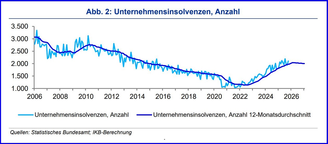 So stabilisiert sich das ifo Geschäftsklima und zeigt hoffentlich im weiteren Verlauf von 2026 zyklische Erholungstendenzen. Dies ist jedoch eher der Konjunkturentwicklung zuzuschreiben – und ist weniger das Ergebnis einer selbstbestimmenden Wirtschaftspolitik. Die seit Jahren anhaltende Verschlechterung der Unternehmensstimmung, insbesondere mit Blick auf die aktuelle Geschäftslage, spiegelt sich auch in der Entwicklung der Insolvenzen wider. Zwar führte die regulatorische Aussetzung der Insolvenzantragspflicht während der Corona‑Pandemie kurzfristig zu einem deutlichen Rückgang der Insolvenzen. Tatsächlich hatten sich die Insolvenzzahlen jedoch bereits nach Jahren des Rückgangs im Jahr 2018 stabilisiert und sind seit dem Auslaufen des Insolvenzaussetzungsgesetzes kontinuierlich gestiegen.Die Entwicklung des ifo‑Geschäftsklimas seit 2024 reicht zwar nicht aus, um einen spürbaren Investitionsschub auszulösen. Die beobachtbare Stabilisierung der Stimmung – insbesondere in der Einschätzung der aktuellen wirtschaftlichen Lage – sollte jedoch zumindest zu einer Stabilisierung der Insolvenzzahlen beitragen. Doch auch hier gilt: Ohne eine deutliche Verbesserung der wirtschaftspolitischen und strukturellen Rahmenbedingungen ist nicht mit einer nachhaltigen Trendwende zu rechnen.