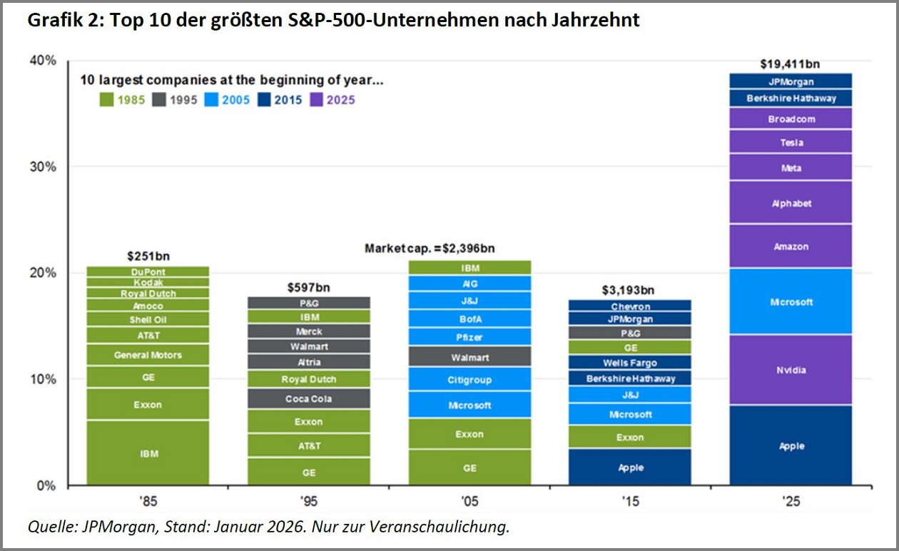 Diese verkürzte Lebensdauer betrifft nicht nur traditionelle Industrien. Die Fluktuation der größten Unternehmen im S&P 500 über mehrere Jahrzehnte hinweg verdeutlicht, wie schnell die heutigen Marktführer verdrängt werden – selbst an der absoluten Spitze des Index (siehe Grafik 2).