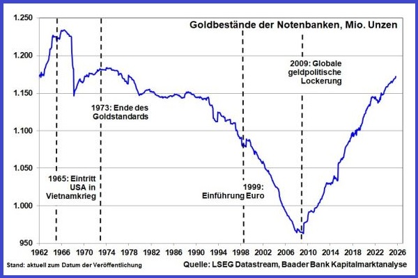 Gold bleibt der sachkapitalistische Rettungsanker angesichts der weltweiten Überschuldung und Bonitätsverschlechterung. Hinzu kommen anhaltende Inflationsrisiken bei dennoch stattfindenden Zinssenkungen in Amerika, was insgesamt einem Goldpreis Richtung 5.000 Dollar je Unze im nächsten Jahr die Bühne bereitet. Stützend wirkt sowieso, dass die internationalen Notenbanken weiter Goldbestände anhäufen. Insbesondere China treibt seine „Unabhängigkeitsbewegung“ von US-Anleihen voran und kauft so viel Gold wie kein anderes Land.