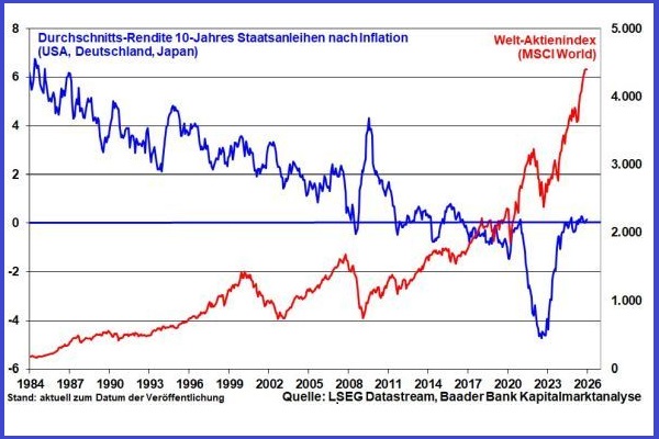 Grafik 5: Durchschnitts-Rendite 10-Jahres Staatsanleihen nach Inflation (USA, Deutschland, Japan) und Welt-Aktienmarkt