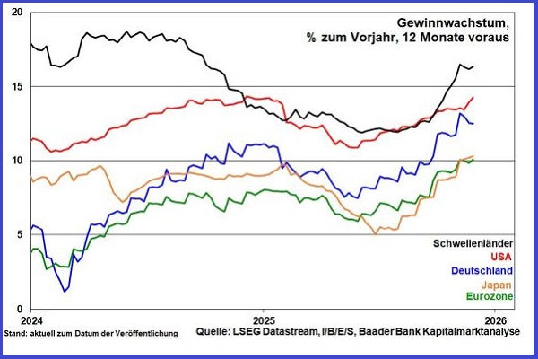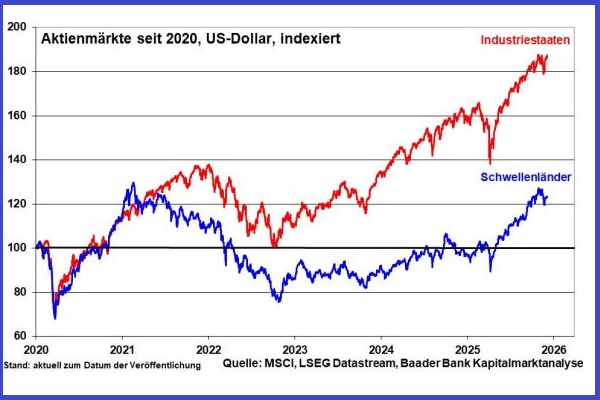 Amerika bleibt die stärkste Wirtschaft der Welt. Zunächst sorgen Nachholeffekte des government shutdown für jahresanfängliche Stabilisierung. Und Republikaner und Demokraten werden mit Blick auf die im November 2026 anstehenden Zwischenwahlen konjunkturfeindliche Scharmützel vermeiden. Ebenso positiv wirken Trumps Zollsenkungen auf Lebensmittel und die in der ersten Jahreshälfte 2026 anstehenden Steuergutschriften an US-Bürger von ca. 100 Mrd. US-Dollar. Nicht zuletzt werden neue „gute“ Schulden für die markante Re-Industrialisierung sowie die Sicherung strategisch wichtiger Lieferketten z.B. bei Halbleitern und Seltene Erden gemacht.