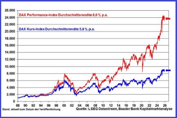 2026 wird wieder ein grundsätzlich guter Dividendenjahrgang, selbst wenn es in der Autobranche zu Kürzungen kommt. So setzen große Kapitalsammelstellen und Pensionskassen Unternehmen unter Druck, möglichst ausschüttungsstark zu bleiben. Vergleicht man die Renditen des reinen Kurs-DAX mit dem bekannteren Performance-DAX, der Ausschüttungen einrechnet und Wiederanlage unterstellt, erkennt man die langfristig hohe Attraktivität des Dividendeneffekts als Zinseszinseffekt.