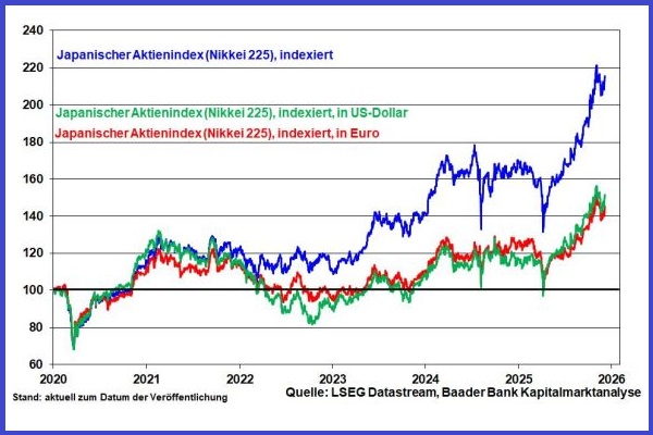 Für japanische Aktien sprechen neben soliden Bilanzen und stabilen Gewinnerwartungen die zunehmend fruchtenden Reformen bei der Unternehmensführung, die zu einer verbesserten Transparenz, Wettbewerbsfähigkeit und einem optimierten Einsatz von Finanzmitteln beitragen. Zudem bleibt die BoJ der beste Freund des japanischen Finanzministers, dessen angekündigtes Konjunkturpaket über umgerechnet 117 Mrd. Euro sie finanziert. Deutliche Renditeerhöhungen bei Staatsanleihen haben da keinen Platz, da sie (finanz-)wirtschaftlich kontraproduktiv wirken. Allenfalls wird die BoJ eine sanft restriktive Geldpolitik durchführen können, um den Yen nur behutsam steigen zu lassen, da Japan eine Exportnation ist. Damit verliert das Thema Währungsverlust bei japanischen Aktien für Euro- und Dollaranleger an Bedeutung.