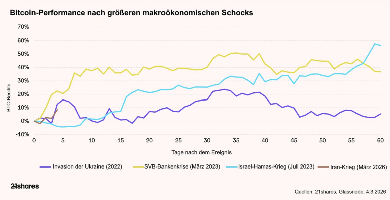 Bitcoin reagierte zunächst ebenfalls volatil und fiel kurzfristig unter wichtige Kursmarken auf bis zu 66.000 Dollar, stabilisierte sich jedoch relativ schnell wieder. In der Vergangenheit haben geopolitische Schocks häufig kurzfristige Rückgänge ausgelöst, gefolgt von schnellen Erholungen, sobald Märkte die makroökonomischen Folgen einpreisten – das zeigen die historischen Beispiele: So legte Bitcoin 30 Tage nach dem russischen Überfall auf die Ukraine um 17 Prozent, binnen einen Monats nach der Krise im Nahen Osten 2023 um 25 Prozent, und kurz nach der US-Bankenkrise im März 2023 gar um 40 Prozent zu.