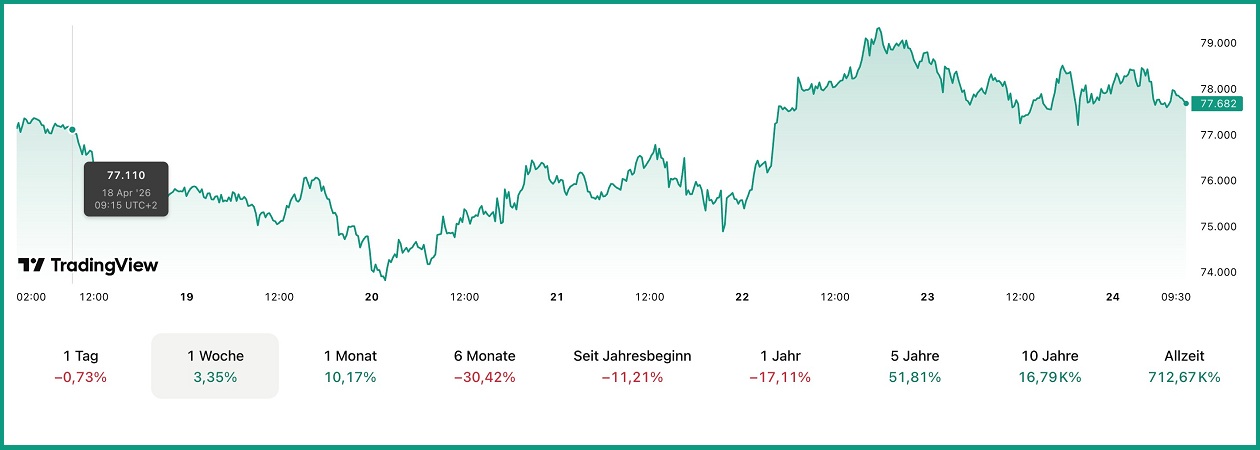 Die folgende Entwicklung des Bitcoin-Kurses gegenüber dem US-Dollar zeigt, dass sich der Markt trotz zwischenzeitlicher Unsicherheiten auf Wochensicht insgesamt stabil bis leicht positiv entwickelt hat. Quelle: TradingView