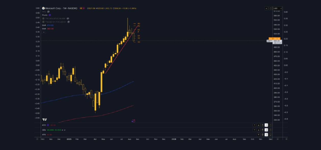 Aus technischer Sicht notiert Microsoft derzeit deutlich über seinem 100-Tage-EMA (blaue Linie) und seinem 200-Tage-EMA (rote Linie). Der Anstieg auf 550 nach Bekanntgabe der Ergebnisse wurde jedoch eindeutig zurückgewiesen, was sich in einer deutlichen Abwärtsbewegung auf dem Wochenchart zeigt. Darüber hinaus wurde die wöchentliche Trendlinie (rot markiert) aufgrund einer deutlichen Momentumänderung Mitte August nach unten durchbrochen, was auf eine potenzielle kurzfristige Trendwende hindeutet, die möglicherweise bereits im Gange ist und mit einer bevorstehenden schwachen Saison zusammenfallen würde. Der wichtigste Bereich, den Verkäufer im Auge behalten sollten, wäre jeder Verkauf aus dem Bereich um 520 USD, wobei eine mögliche erneute Prüfung der Unterseite der durchbrochenen Trendlinie ein wahrscheinlicher Katalysator für kurzfristige Verkäufer wäre.