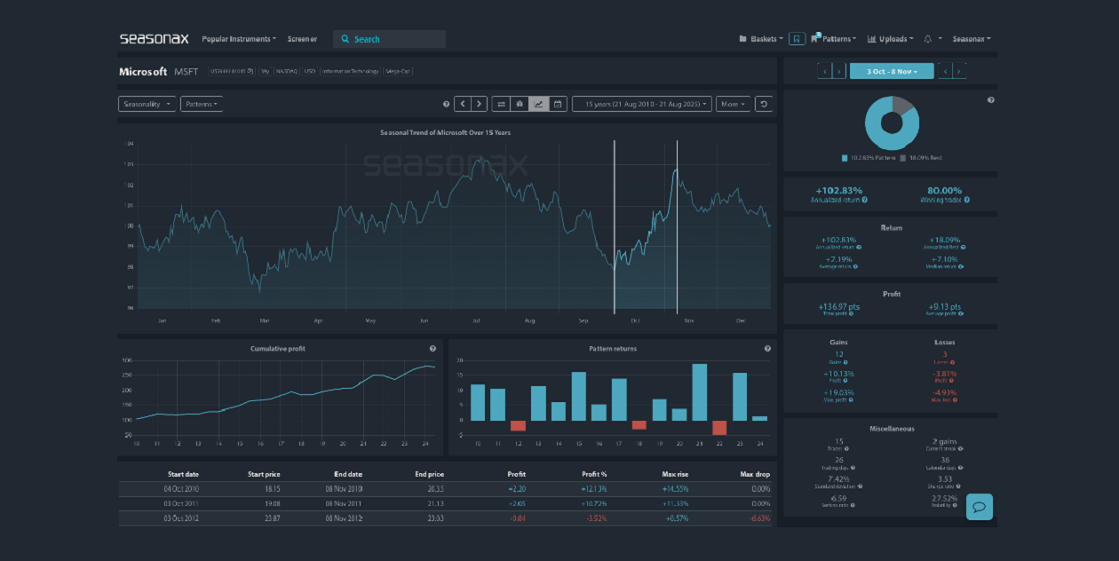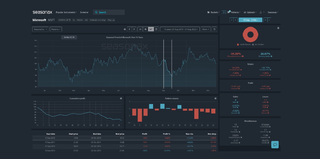 Wer nur zwischen 15.09. und 02.10 in Microsoft investierte, verzeichnete Verluste. Quelle: Seasonax