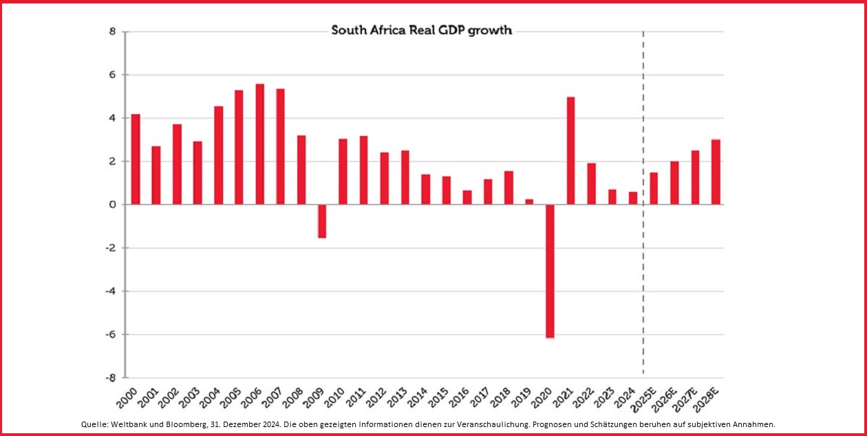 Ein Schlüsselfaktor für diese verbesserten Aussichten ist die wirtschaftsfreundlichere Regierung, entstanden nach den Wahlen im Mai 2024. Die Regierung der Nationalen Einheit hat sich öffentlich dazu verpflichtet, Korruption und Ineffizienz zu bekämpfen. Die Sanierung der vernachlässigten Infrastruktur steht ganz oben auf der politischen Agenda und schafft die Voraussetzungen für eine strukturelle Erholung der Wirtschaftsleistung und des Investorenvertrauens. Außerdem soll die Betriebssicherheit des nationalen Stromversorgers Eskom wiederhergestellt werden, was zu einer anhaltenden Erholung der Stromproduktion führen und die Industrie und den Bergbau unterstützen soll.