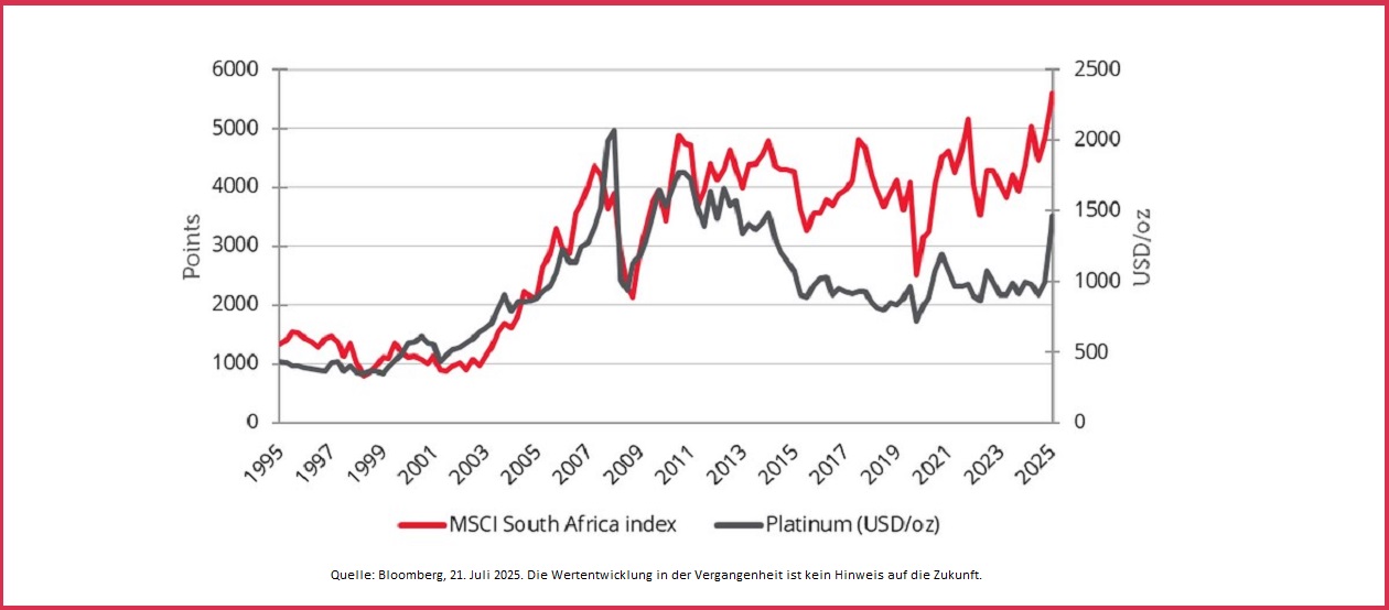 Südafrika profitiert zudem von einem positiven Preisumfeld für Edelmetalle: Das Land ist der weltweit größte Produzent von Platingruppenmetallen (PGMs) und hat einen Anteil von 45 Prozen an der globalen Produktion. Höhere Preise und ein knapperes Angebot – bedingt durch Investitionszurückhaltung, strengere chinesische Abgasnormen und eine steigende Nachfrage nach Platinschmuck – stärken die positiven Aussichten führender lokaler Produzenten wie Impala Platinum und Valterra Platinum. Die folgende Abbildung zeigt den starken Einfluss der PGM-Preise auf die südafrikanischen Bewertungen.