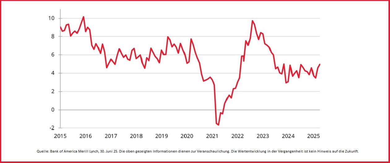 Vor dem Hintergrund einer sich verbessernden wirtschaftlichen Lage gehen wir davon aus, dass inländische Banken im kommenden Jahr von einem stärkeren Kreditwachstum profitieren werden (Abb. 4). Dies sollte sich in einem zweistelligen Ertragswachstum niederschlagen, wenn die Zinsen fallen und die Unternehmensinvestitionen wieder anziehen. Unsere beiden südafrikanischen Bankbeteiligungen sind Capitec und Standard Bank.