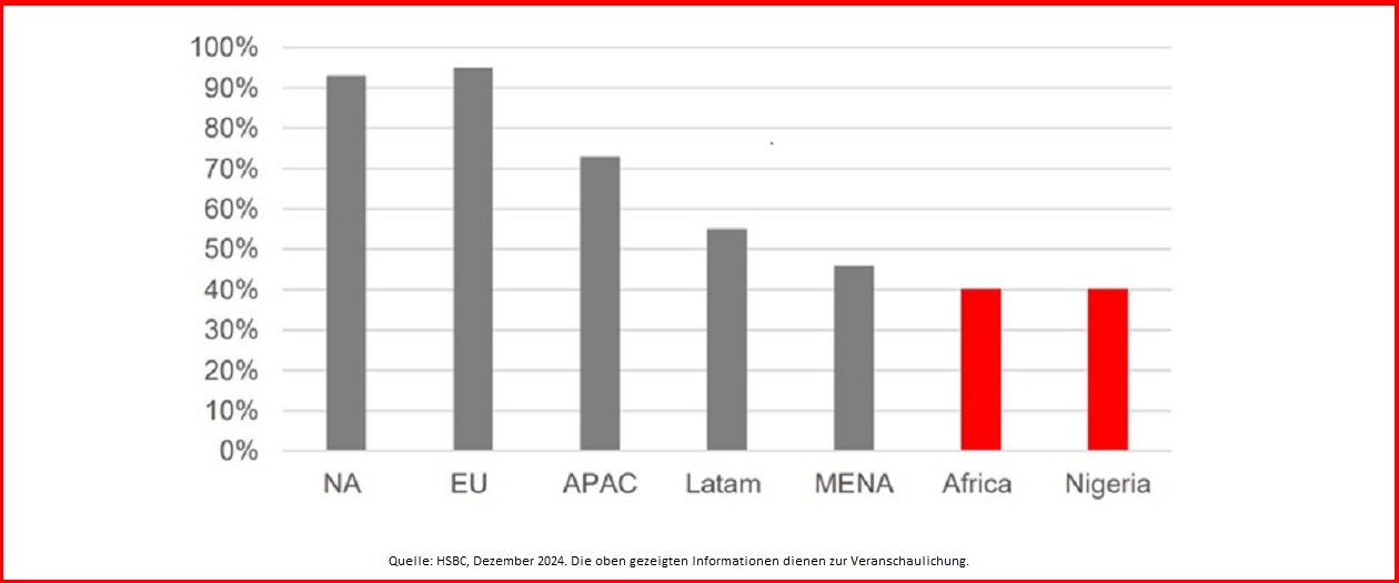 Unsere Beteiligung an MTN, dem größten Telekommunikationsunternehmen in Afrika, stieg bis zur Jahresmitte in US-Dollar um 69 Prozent. Die Bankendurchdringung in Afrika ist nach wie vor sehr gering (Abb. 3) und wir von Redwheel sehen einen starken Wachstumstrend in der Branche, da Telekommunikationsbetreiber die finanzielle Inklusion durch mobile Geldtransfers vorantreiben und so die Barzahlungen ersetzen. Die Fintech-Sparte von MTN macht einen wachsenden Anteil am Konzernumsatz aus. Wir erwarten, dass das Unternehmen mit seiner margenstarken, hochskalierbaren mobilen Geldplattform ein starkes Wachstum erzielen wird.