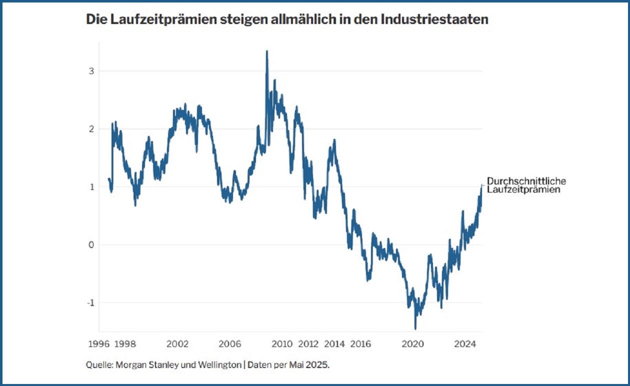 Wir rechnen weiterhin mit erhöhter Volatilität an den Zinsmärkten, insbesondere im Bereich der längeren Laufzeiten. Die Zinsstrukturkurven in den Industrieländern haben sich zwar inzwischen normalisiert, könnten aber aufgrund der anhaltenden Inflation und der hohen Staatsausgaben noch steiler werden. Die wachsenden Bedenken hinsichtlich der Tragfähigkeit der Verschuldung könnten zu höheren Laufzeitprämien in den Industrieländern, insbesondere in den USA, führen. Diese Dynamik geht aus Abbildung 1 deutlich hervor: Zum Zeitpunkt der Erstellung dieses Beitrags war die durchschnittliche Laufzeitprämie in den Industrieländern erstmals seit elf Jahren wieder auf über 1,0 Prozent gestiegen.