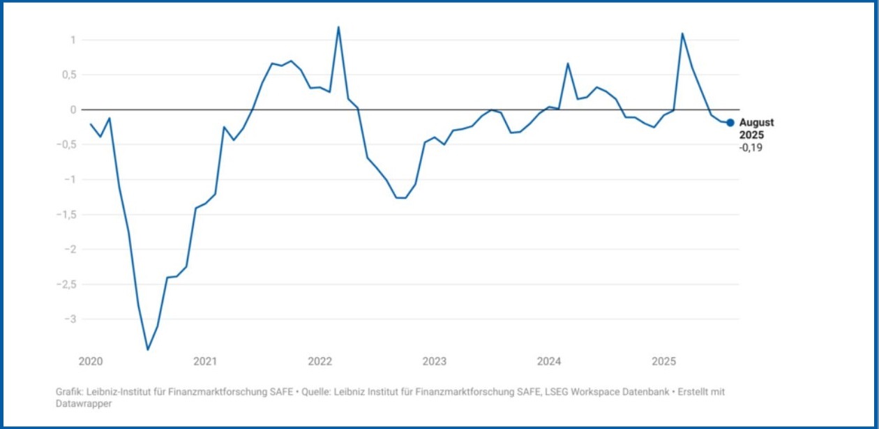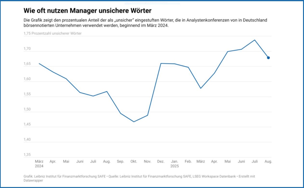 Derzeit will sich niemand zu weit aus dem Fenster lehnen“. Es bestehen weiterhin Risiken hinsichtlich der Zollvereinbarung der EU mit den USA. Viele Details sind unsicher. Das zeigen Aussagen von Führungskräften auf den Analystenkonferenzen im Juli wie „wir bleiben wachsam“ oder „wir glauben die Stimmung verbessert sich, aber wir bleiben in Alarmbereitschaft“. Der Anteil an Wörtern, die in der Managerkommunikation Unsicherheit ausdrücken, sinkt zwar erstmals seit vier Monaten, bleibt jedoch mit 1,64 Prozent hoch.