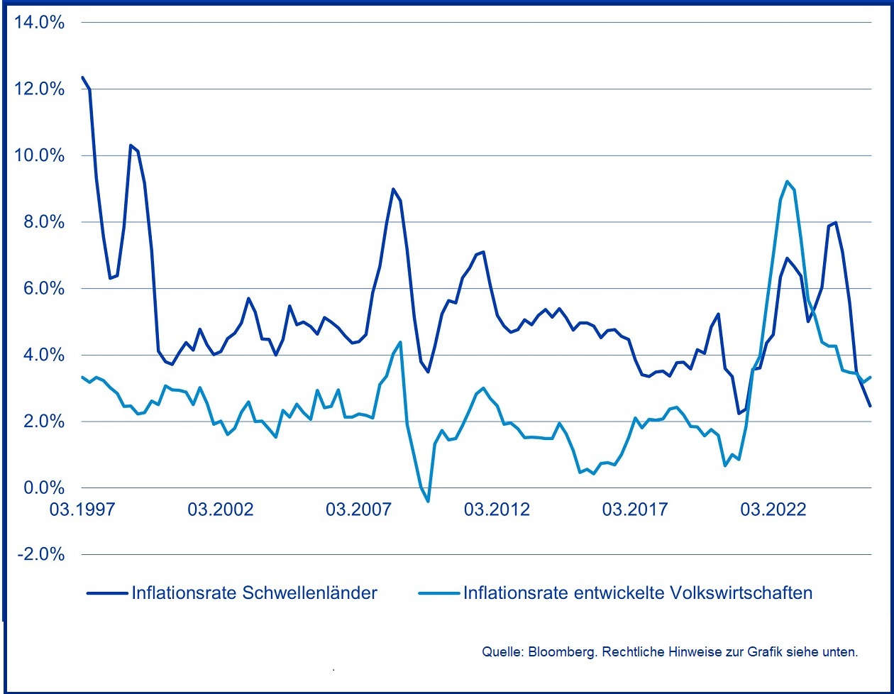 Eine der bemerkenswertesten Entwicklungen der letzten Jahre war der signifikante Rückgang der Inflation in vielen Schwellenländern. In diesem Jahr dürfte die Teuerung historische Tiefststände erreichen – sowohl in absoluten Zahlen als auch im Vergleich zu entwickelten Märkten. Dieser Trend wird durch zwei Hauptfaktoren angetrieben: durch das entschlossene Handeln vieler Zentralbanken während des Inflationsanstiegs in den Jahren 2021 und 2022 sowie durch den steigenden Anteil chinesischer Importe in Schwellenländern – wegen der niedrigen Produktionskosten in der Volksrepublik wurde die dortige Disinflation oder sogar Deflation in diese Schwellenländer exportiert.