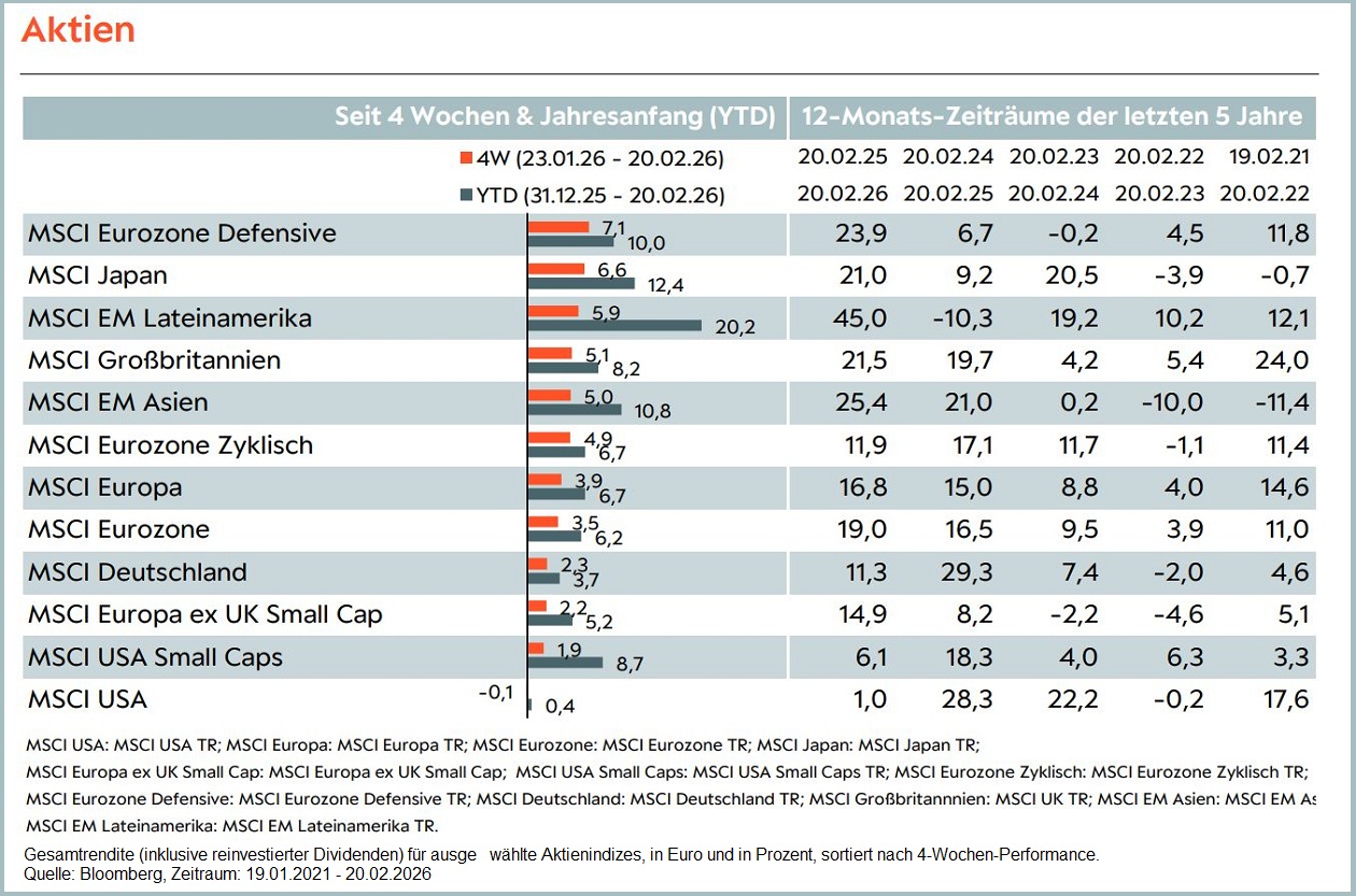 - Neben lateinamerikanischen Aktien, welche seit Jahresbeginn mit rund 20 Prozent die stärkste Aktienregion darstellt, profitierten zuletzt insbesondere defensive Aktien aus der Eurozone sowie japanische Aktien.