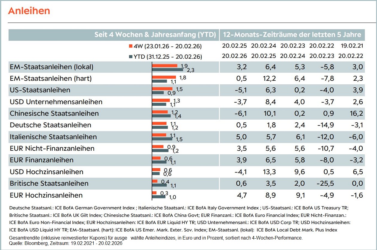 - In den vergangenen vier Wochen legten alle hier dargestellten Anleihesegmente zu. Besonders profitieren konnten Lokal- und Hartwährungsanleihen der Schwellenländer sowie US-Staatsanleihen.