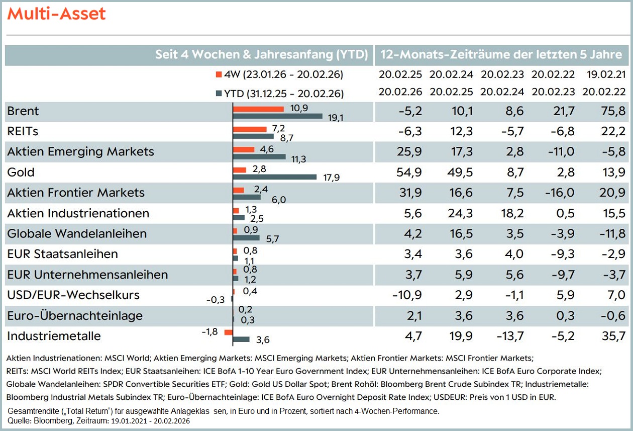 Heute erschien zunächst der Ifo-Geschäftsklimaindex (Feb.) für Deutschland. Am Dienstag folgt aus den USA das Conference Board Konsumentenvertrauen (Feb.). Am Mittwoch stehen die finalen Verbraucherpreise (Jan.) für die Eurozone auf dem Datenkalender. Am Donnerstag richtet sich der Fokus der Märkte erneut auf die Erstanträge für Arbeitslosenunterstützung (Feb.) aus den USA, während am Freitag die Verbraucherpreise (Feb.) für Teile der Eurozone und Japan erwartet werden. Nächste Woche wird neben den ISM-Einkaufsmanagerindizes (Feb.) auch die Arbeitslosenrate (Feb.) für die USA im Fokus der Märkte stehen.
